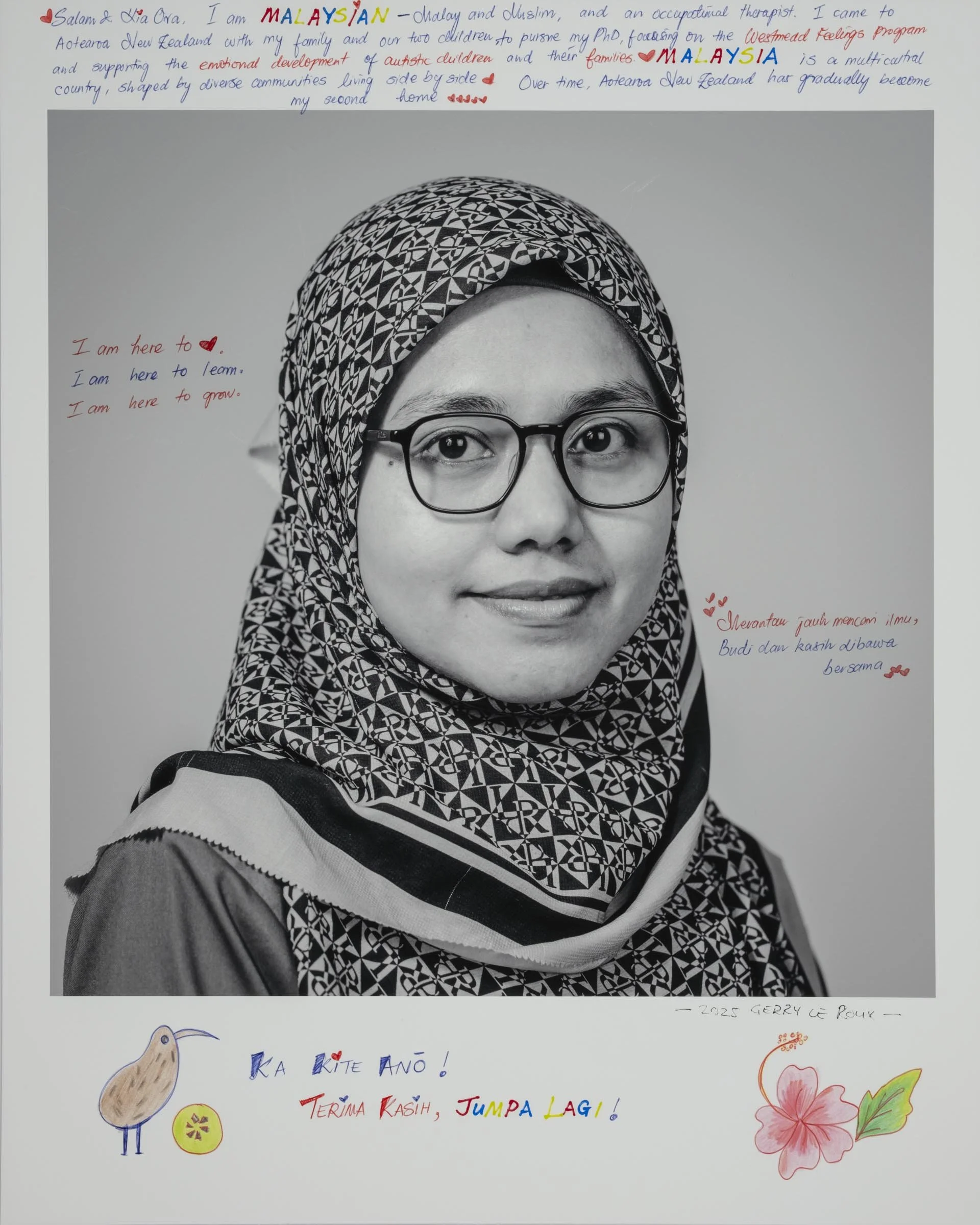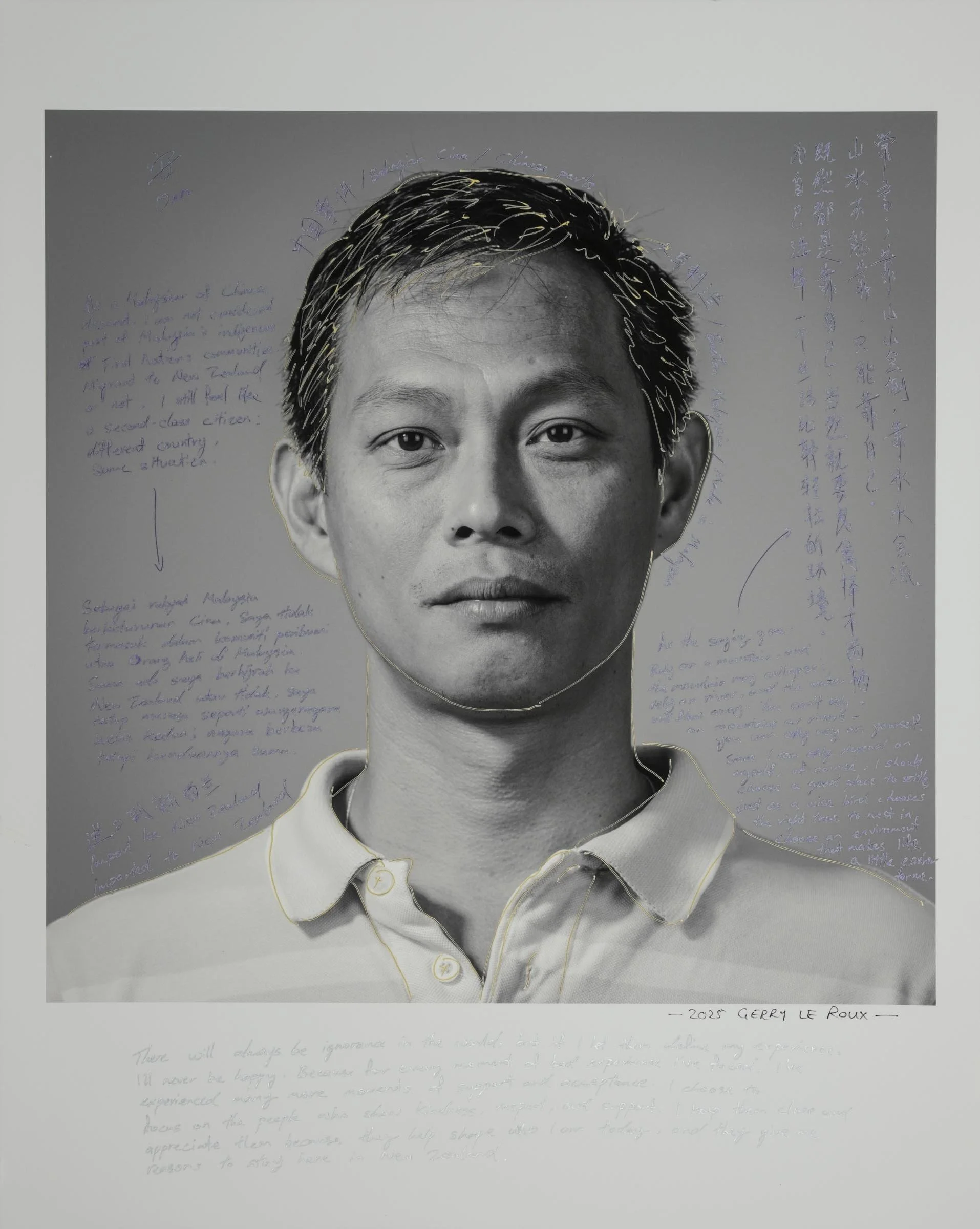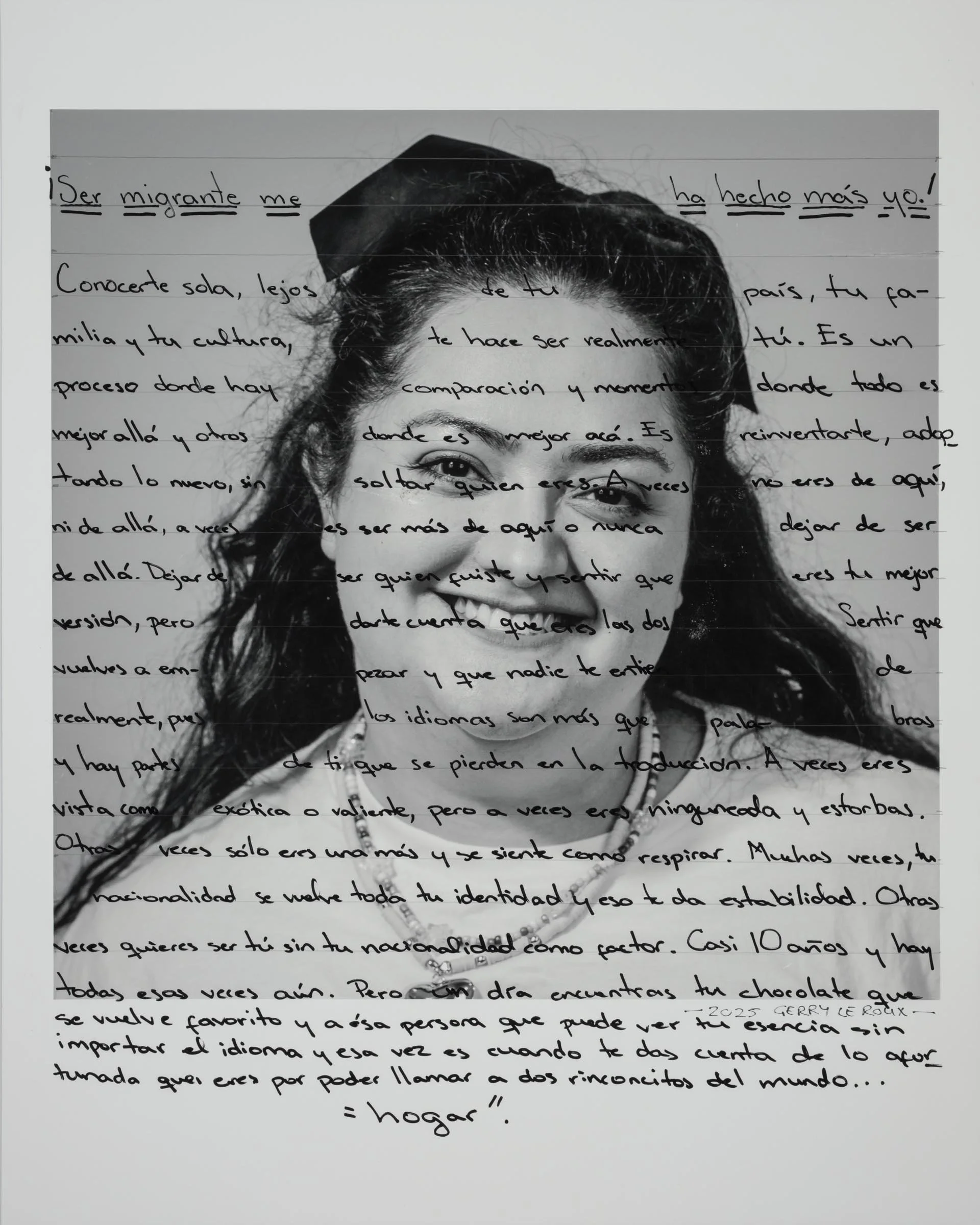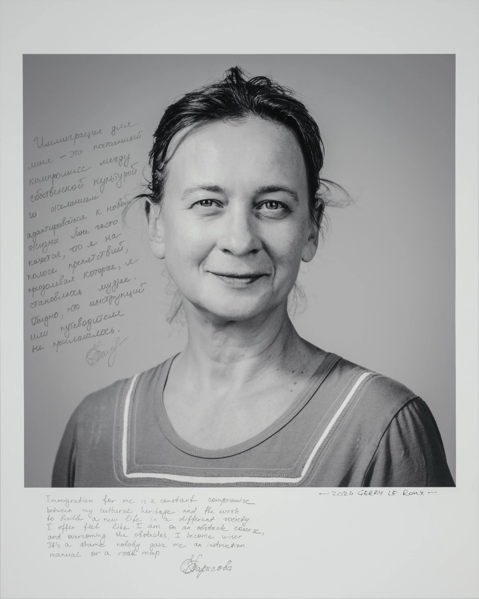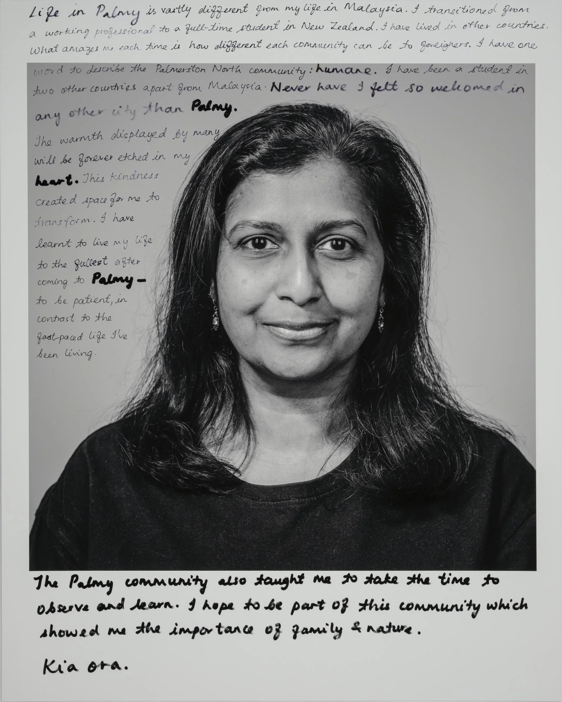 Being a part of the project involves having your head-and-shoulder portrait taken and then writing a short reflection about being a migrant, directly onto the photographic print. Your handwritten write-up can be in your native language or in English.