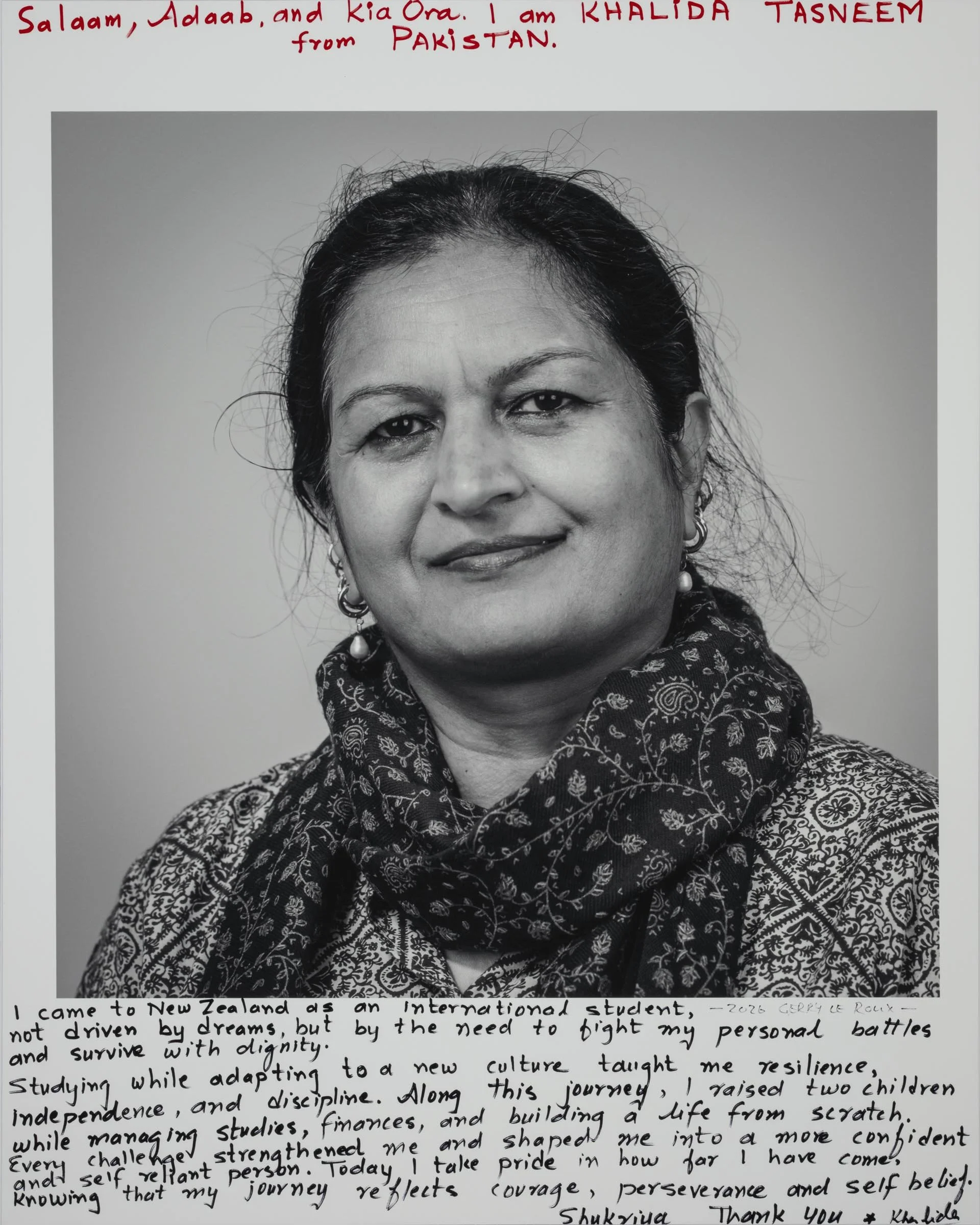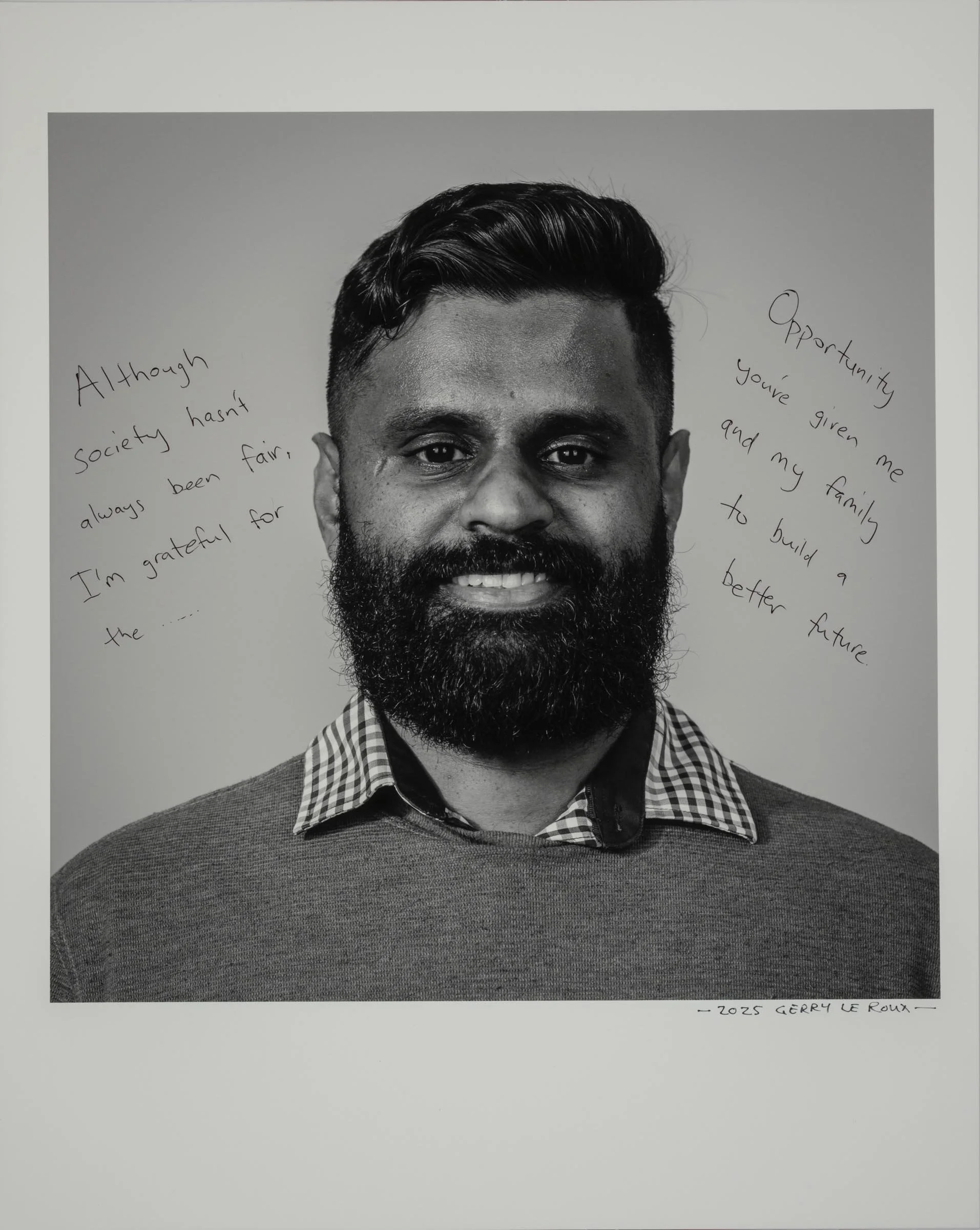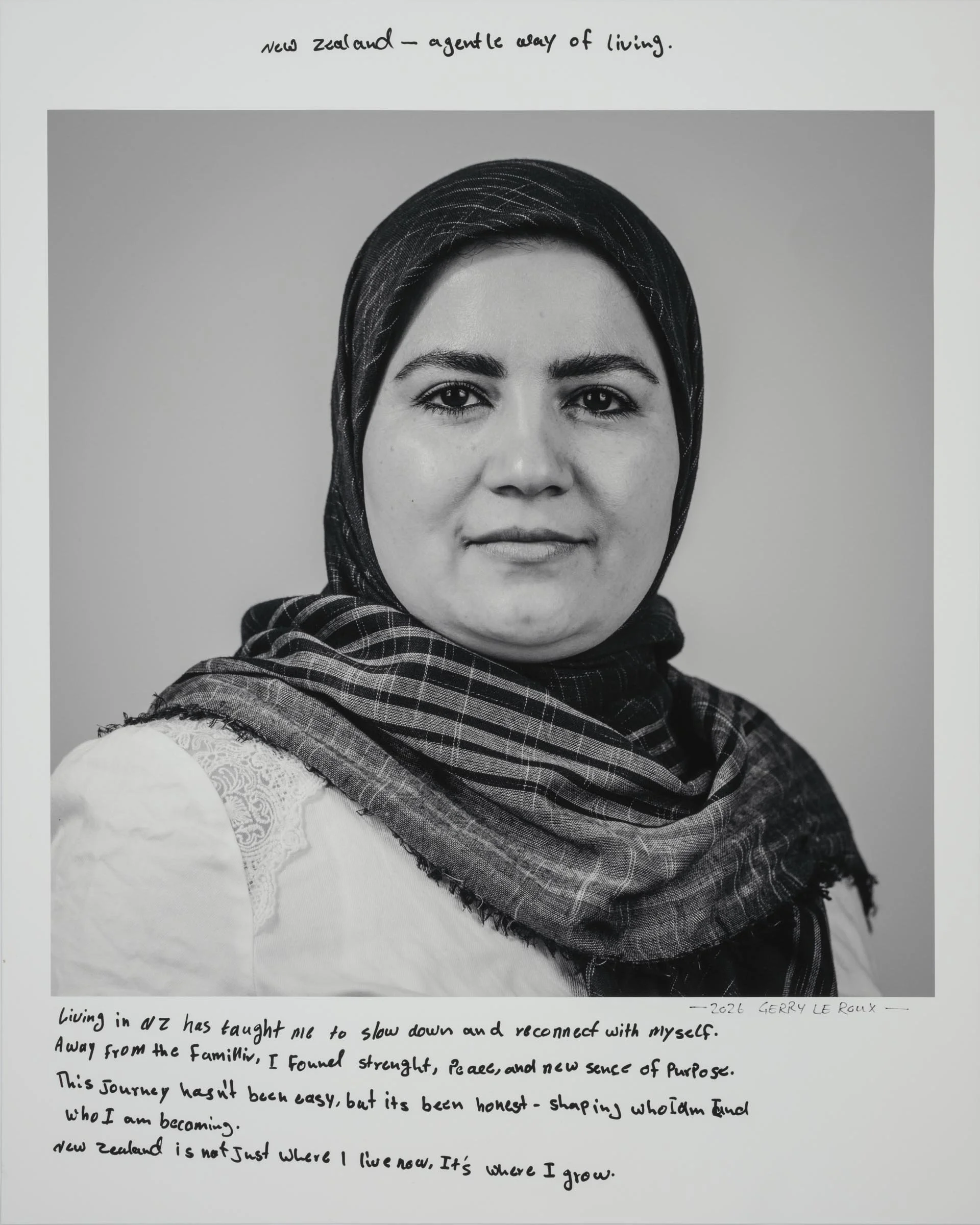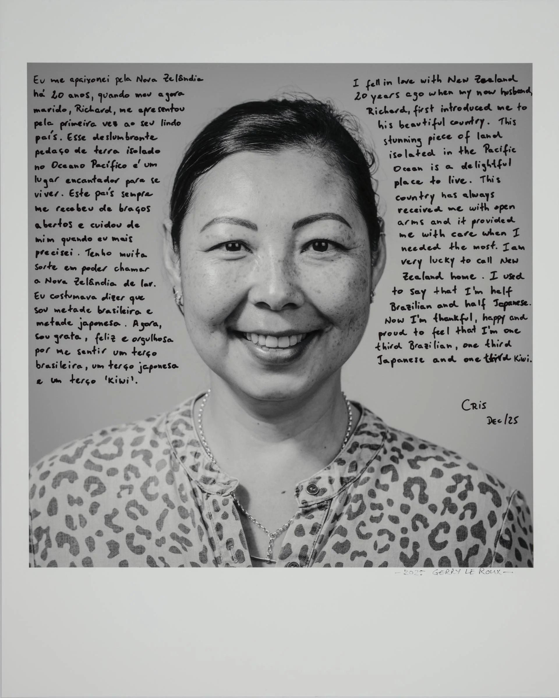 Being a part of the project involves having your head-and-shoulder portrait taken and then writing a short reflection about being a migrant, directly onto the photographic print. Your handwritten write-up can be in your native language or in English.